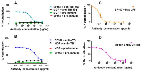 Neutralizing activity of IgGs isolated from sera of immunized animals against SF162.LS pseudovirus. The figure depicts neutralization curves for anti-TBI_tag (A), anti-nTBI (B) rabbit IgGs, as well as for human mAbs 2F5 (C) and VRC01 (D). 2F5 and VRC01 were used as positive controls. A pool of IgGs purified from pre-immune sera of rabbits (IgGs-pre-immune) was used as a negative control. Lentiviral particles pseudotyped with Marburg envelope glycoprotein (MGP) were used as a specificity control virus in the neutralization assay.