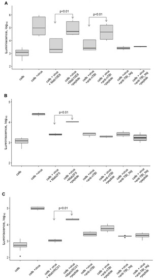 Inhibition of virus-neutralizing activity of antibodies by synthesized peptides: (A) 10E8 [NWFNITNWLWYIK], (B) 2F5 [NEQELLELDKWASLWNK], (C) VRC01 [VSWPELYKWTWS]. The following combinations were tested in the assay: cell + virus; cell + virus + monoclonal mAb 10E8 or 2F5, or VRC01; cell + virus + monoclonal mAb 10E8 or 2F5, or VRC01 + corresponding synthetic peptide; cell + virus + anti-nTBI IgG; cell + virus + anti-nTBI IgG + synthetic peptide; cell + virus + anti-TBItag IgG; cell + virus + anti-TBItag IgG + synthetic peptide. Relative luminescence intensity is indicated on the Y-axis (log10 RLU). Statistical differences between groups cell + virus + mAb 10E8, or 2F5, or VRC01 and cell + virus + mAb 10E8, or 2F5, or VRC01 + synthetic peptide is p < 0.01; statistical differences between groups cell + virus + anti-nTBI IgG and cell + virus + anti-nTBI IgG + synthetic peptide is p < 0.01.