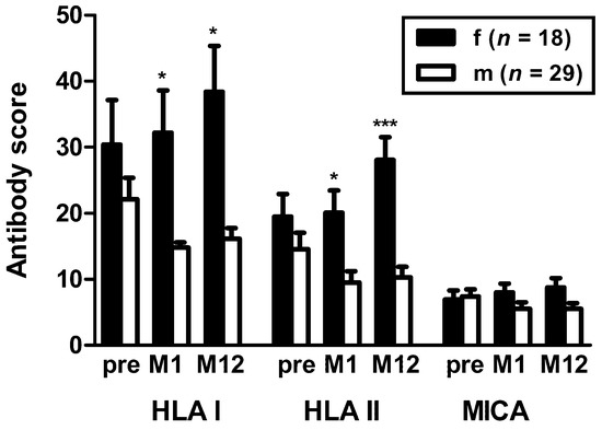 Comparison of HLA/MICA antibodies in female and male kidney transplant recipients vaccinated with Prevenar. The antibody score is the sum of responses to either HLA class I, class II or MICA Luminex™ beads. The data pre vaccination and at month 1 (M1) and month 12 (M12) after vaccination represent mean and standard error of the mean (SEM). Score values in females and males were compared by Mann-Whitney test. HLA I—HLA class I; HLA II—HLA class II; MICA—major histocompatibility class I-related chain A; * p < 0.05, *** p < 0.0001.