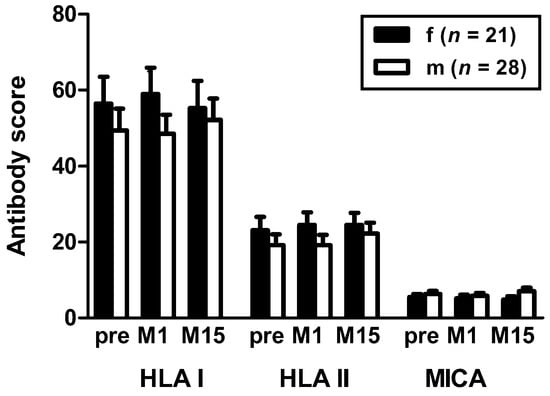 Comparison of HLA/MICA antibodies in female and male kidney transplant recipients of a historical cohort vaccinated with Pneumovax [14]. The antibody score is the sum of responses to either HLA class I, class II or MICA Luminex™ beads. The data pre vaccination and at month 1 (M1) and month 15 (M15) after vaccination represent mean and standard error of the mean (SEM). Score values in females and males did not differ significantly (Mann-Whitney test). HLA I—HLA class I; HLA II—HLA class II; MICA—major histocompatibility class I-related chain A.
