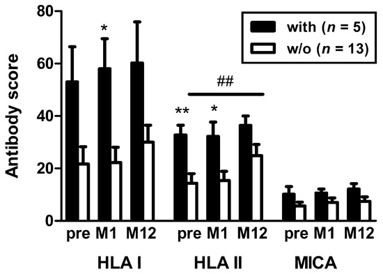 Comparison of HLA/MICA antibodies in females with and without antibody-mediated rejection after vaccination with Prevenar. Antibodies were considered pre vaccination and at month 1 (M1) and month 12 (M12) thereafter. Data represent mean and standard error of the mean (SEM). The antibody score is the sum of responses to either HLA class I, class II or MICA Luminex™ beads. Score values for HLA and MICA antibodies in females with vs. without rejection were higher (* p < 0.05, ** p < 0.005, Mann-Whitney test). Score values for HLA class II antibodies in females without rejection were significantly higher at month 12 vs. pre vaccination (## p = 0.008, Wilcoxon matched pairs test). HLA I—HLA class I; HLA II—HLA class II; MICA—major histocompatibility class I-related chain A; w/o—without.