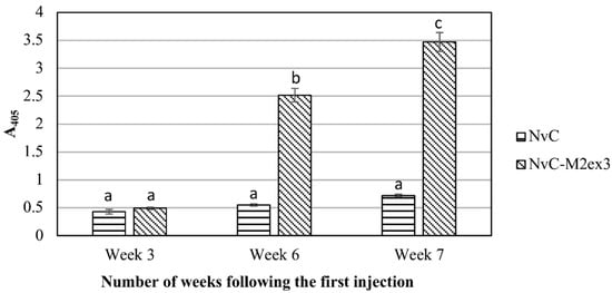 Immunogenicity of the chimeric protein in BALB/c mice. Serum samples of BALB/c mice immunized with NvC or NvC-M2ex3 were collected at three weeks after the primary injection, three weeks after the first booster, and one week after the second booster by submandibular bleeding. Serum samples (1:2000 dilution) from mice (n = 8) of respective groups were pooled and analyzed by enzyme-linked immunosorbent assay (ELISA). The microtiter plate wells were coated with the M2e synthetic peptide and the anti-M2e antibody reacted with the peptide was detected with the anti-mouse antibody conjugated to alkaline phosphatase. a, b, and c indicate statistical significance (p < 0.001) of the results within each time point and when compared to other time points.
