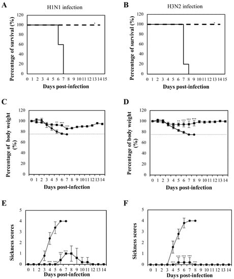 3.2. Survival and Morbidity of Mice Challenged with Influenza A Viruses