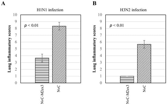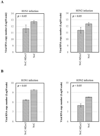 Viral RNA copy number in the lungs and oropharynges of the infected mice was determined by qPCR using primers specifically targeting the matrix gene of IAV. The viral RNA copy number was calculated using Equation (1). The mice immunized with NvC-M2ex3 exhibited a 10-fold reduction of viral RNA copy number in the lungs compared to the control group after being challenged with H1N1 or H3N2 (Figure 3A). This result demonstrates the infection-permissive nature of NvC-M2ex3 which allows limited virus replication instead of total inhibition. The oropharynges of the mice immunized with NvC-M2ex3 also showed a 10-fold reduction in the viral RNA copy number compared to the control group immunized with NvC (Figure 3B). The presence of IAV in the oropharynges of the mice indicates viral shedding and potential transmission of the virus between animals via direct close contact.