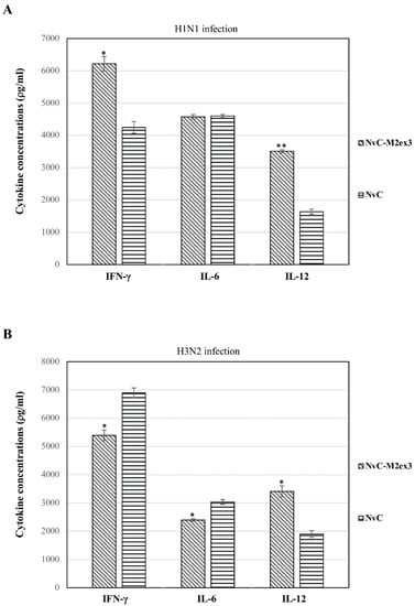 Concentration of cytokines in the lungs of mice (n = 3) infected by H1N1 and H3N2. The mice vaccinated with NvC-M2ex3 demonstrated different cytokine profiles after being challenged with H1N1 and H3N2. (A) A higher level of IFN-γ and IL-12 was detected in the lungs of the mice immunized with NvC-M2ex3 compared to the control group after being challenged with H1N1. (B) On the contrary, when the mice were challenged with H3N2, they exhibited lower concentrations of IFN-γ and IL-6, although a higher level of IL-12 was observed. The asterisks (* p < 0.05, ** p < 0.01,) indicate statistical significance of the results between different treatment groups.