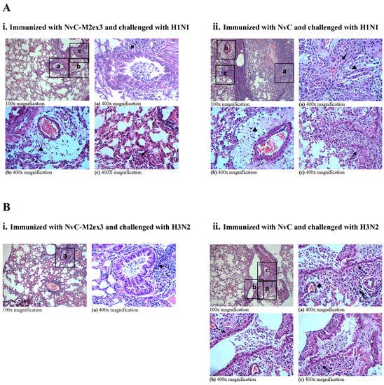 Hematoxylin and Eosin (H and E) staining of the lungs of mice (n = 3) immunized with the chimeric proteins and challenged with influenza A virus H1N1 or H3N2. (A) The lungs of mice immunized with (i) NvC-M2ex3 or (ii) NvC at day five post-infection with H1N1. (B) The lungs of mice immunized with (i) NvC-M2ex3 or (ii) NvC at day five post-infection with H3N2. Insets with letters (a, b, c) are projected at 400x magnification as (a), (b), and (c). Dashed and solid arrows indicate bronchiolitis and interstitial inflammation respectively, and triangles indicate edema, n = 3.