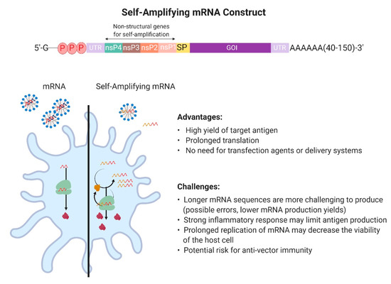 - Brito, L.A.; Kommareddy, S.; Maione, D.; Uematsu, Y.; Giovani, C.; Berlanda Scorza, F.; Otten, G.R.; Yu, D.; Mandl, C.W.; Mason, P.W.; et al. Self-amplifying mRNA vaccines. Adv. Genet. 2015, 89, 179–233. [Google Scholar] [PubMed]
