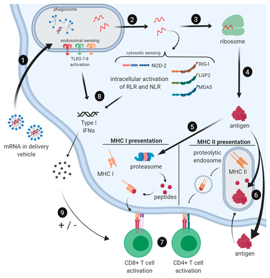 - De Beuckelaer, A.; Grooten, J.; De Koker, S. Type I Interferons Modulate CD8+ T Cell Immunity to mRNA Vaccines. Trends Mol. Med. 2017, 23, 216–226. [Google Scholar] [CrossRef] [PubMed]