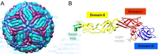 Structure of WNV. (A) Cryo-electron microscopy reconstruction of a WNV particle (Protein Data Bank accession 3J0B). E monomers are blue, purple, and turquoise. (B) Ribbon diagram of the crystal structure of WNV E glycoprotein (Protein Data Bank accession 2HG0). Domain I is red, domain II is yellow, domain III is blue, and the fusion loop is green. The N-linked sugar moiety of Asn 154 is also displayed. Images were produced using Chimera package [45].