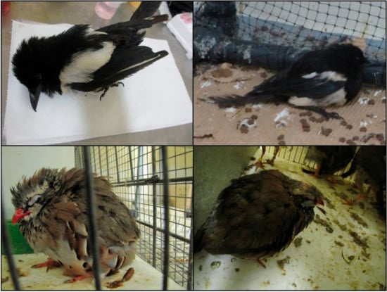 Clinical signs observed in experimentally infected birds. Magpies (upper panel) and partridges (lower panel) experimentally infected with WNV. Birds that die develop high morbidity hours before their death. Evident clinical signs like loss of appetite, ruffled feathers, paralysis, hunchback position, and unresponsiveness are observed in WNV-infected birds from 3 to 8 days post-infection (dpi).
