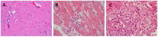 Macroscopic lesions are observed in infected birds between 7 and 10 days after infection, although it can be delayed until 21 days post-infection (dpi) [79], and even become chronic [47]. The most affected organs are the brain, presenting encephalitis with cerebellar involvement, heart, liver, spleen, and kidney [75,80,81]. Lesions, such as diffuse pallor or pale foci in epicardium and myocardium [70], or in the hepatic, splenic, and renal parenchyma [80], as well as hepatomegaly and splenomegaly [58,74,75], have also been reported.