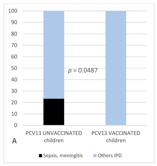 All through the study, severe systemic infections were 10/43 (23.3%) in unvaccinated patients and 0/16 (0.0%) in vaccinated children, with a statistically significant difference (p = 0.0487) (Figure 4A; Table 3). Patients admitted to the pediatric intensive care unit (PICU) were 17/43 (39.5%) among non-vaccinated children and 1/16 (6.3%) in vaccinated children (p = 0.0233, OR = 0.10, 95% CI = 0.005−0.87) (Figure 4B; Table 3). PCV13-vaccinated children are thus less prone to develop ser3-IPDs with extremely severe clinical course than children who did not received PCV13 (p = 0.0233, OR = 0.10, 95% CI = 0.005−0.87).