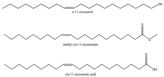 Chemical structures of (Z)-11-eicosenol, methyl cis-11-eicosenoate and cis-11-eicosenoic acid.