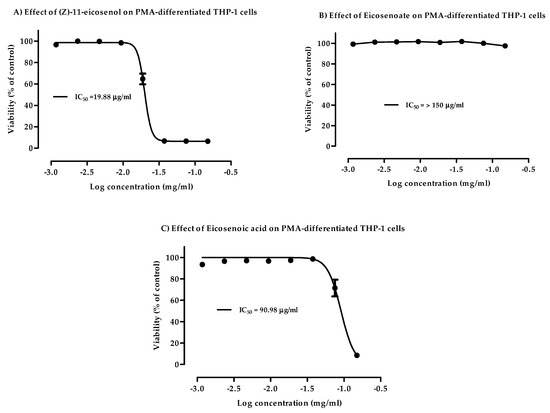 The potential cytotoxicity of (Z)-11-eicosenol (11E-OH), eicosenoate (11E-ester) and eicosenoic acid (11E-acid) (Figure 1) on PMA-differentiated THP-1 cells was evaluated to select an appropriate final concentration for further tests. Clear dose-dependent toxicity to THP-1 cells was observed for 11E-OH and its 11E-acid form. The lowest IC50 value at 19.88 µg/mL was observed for 11E-OH, whereas this value was 90.98 µg/mL for 11E-acid (Figure 2A–C). By contrast, the 11E-ester form was nontoxic to THP-1 cells, with an IC50 value greater than 150 µg/mL. ELISAs were also conducted to assess the cytokine levels in THP-1 derived-macrophage cells upon treatment with these three compounds. As shown in Table 1, the final concentrations for cytokine assessments were chosen as those that were below the IC50 values and resulted in >90% of the cells remaining viable. There was no difference in effect between the solvent control DMSO alone (1.5% final concentration) and negative control media on cell viability.