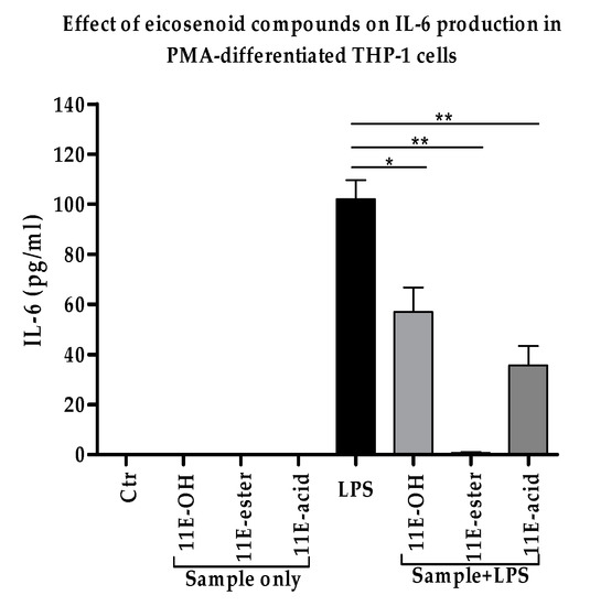 Effect of eicosenoid compounds on the production of IL-6 by phorbol 12-myristate 13-acetate (PMA)-differentiated THP-1 cells in the absence and presence of LPS (0.5 µg/mL). The IL-6 levels were significantly decreased in all three combination treatments when compared with positive control LPS (n = 3). Ctr: Untreated control; LPS: Lipopolysaccharide; (11E-OH): (Z)-11-eicosenol; (11E-ester): Eicosenoate; (11E-acid): Eicosenoic acid; *: Significant (p < 0.05); **: Significant (p < 0.01).