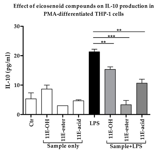 Effect of eicosenoid compounds on the production of IL-10 by phorbol 12-myristate 13-acetate (PMA)-differentiated THP-1 cells in the absence and presence of LPS (0.5 µg/mL). The IL-10 levels were significantly decreased in all three combination treatments when compared with positive control LPS (n = 3). Ctr: Untreated control; LPS: Lipopolysaccharide; (11E-OH): (Z)-11-eicosenol; (11E-ester): Eicosenoate; (11E-acid): Eicosenoic acid; **: Significant (p < 0.01); ***: Significant (p < 0.001).