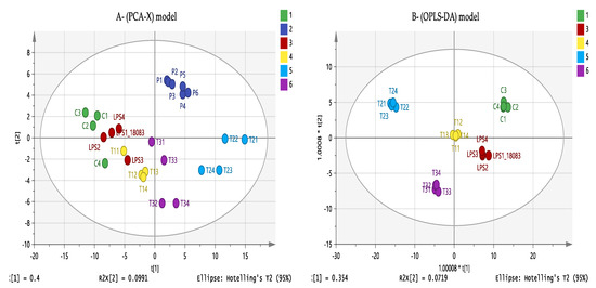 As shown in Figure 7A, principle component analysis (PCA) showed an absence of outliers. In addition, pooled quality control samples (QC, P1–6) produced a single tight cluster in the centre of the dataset, confirming the stability, precision and validity of the instrumental analytical method. Orthogonal partial least squares discriminant analysis (OPLS-DA), a supervised model for sample classification, showed a clear separation of each combination treatment, indicating unique metabolite profiling (Figure 7B). The OPLS-DA model parameters and validation of the plot suggest a strong model, with the p value associated with the cross-validation (CV)-ANOVA = 1.96 × 10−21, indicating that the model was valid.