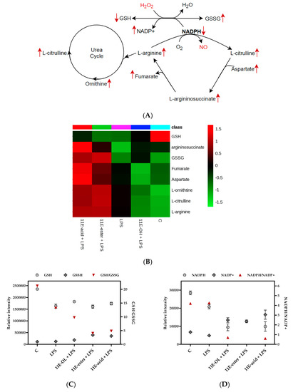 An imbalance between cellular oxidants and antioxidants can potentially lead to oxidative stress and cell damage. Therefore, antioxidant defence is required for cellular adaptation to stress conditions [48]. Glutathione (GSH), an important protective antioxidant tripeptide, has been implicated in inflammatory responses and immune modulation [49]. GSH is oxidised to glutathione disulphide (GSSG) when it reacts with peroxide (H2O2) in the presence of glutathione peroxidase, an enzyme that facilitates the inactivation of peroxide [50]. GSSG can be reduced again using nicotinamide adenine dinucleotide phosphate (NADPH). Therefore, regulation of both the NADPH/NADP+ and GSH/GSSG ratios is tightly coupled to the control of oxidative stress (Figure 9) [51,52]. A decrease in the level of GSH and an increase in its product GSSG was observed in this study; this response has been reported as a hallmark of oxidative stress [53,54]. A large depletion in the level of NADPH and an increase in NADP+ were observed in the current study after the combination treatment of eicosenoids and LPS (Table 2). NADPH generates ROS through NADPH oxidase, and it also serves as a substrate for the conversion of arginine to citrulline and NO [55,56]; arginine and citrulline were also strongly elevated in response to the treatments with LPS in combination with 11E-ester or 11E-acid (Figure 9).