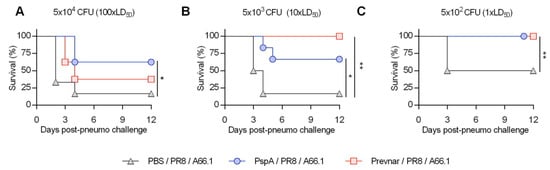 Next, we infected mice with lower doses of bacteria to determine whether we had overwhelmed the protective efficacy of the vaccine (Figure 2B,C). Influenza-infected mice were challenged with 5 × 102 bacterial CFU (1 × LD50 for co-infection) (Figure 2C). All the PspA and Prevnar vaccinated mice survived the 1 × LD50 secondary A66.1 challenge. In contrast, only 50% of unvaccinated co-infected mice survived (Figure 2C). No deaths were observed in the vaccinated or unvaccinated singly infected groups (Figure S1). Similar effects were observed in mice challenged with 5 × 103 bacterial CFU (10 × LD50) (Figure 2B). These results suggest that vaccine-induced protection against co-infection is dependent on the bacterial challenge dose.