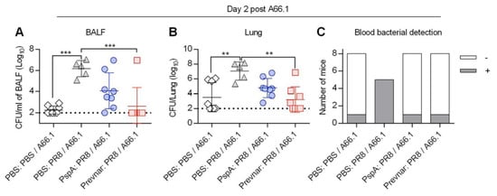 To assess whether the increases in survival were associated with enhanced bacterial clearance, bacterial burden in the bronchoalveolar lavage fluid (BALF), lung tissue, and blood was enumerated in mice immunized and challenged with 5 × 103 CFU of S. pneumoniae A66.1 following influenza infection (Figure 3). As expected, unimmunized co-infected mice had significantly more bacteria in their BALF and lung tissue compared to unimmunized mice singly infected with bacteria. Both PspA and Prevnar immunized co-infected mice had fewer recoverable bacteria compared to the unimmunized co-infected mice (Figure 3A,B). Finally, all five unimmunized co-infected mice had bacteria in their blood, indicative of dissemination, compared to one out of eight mice in the bacteria-only and immunized groups (Figure 3C). These results suggest that immunization with PspA controls pulmonary bacterial outgrowth and bacteremia following a low-dose bacterial challenge in influenza-infected mice.