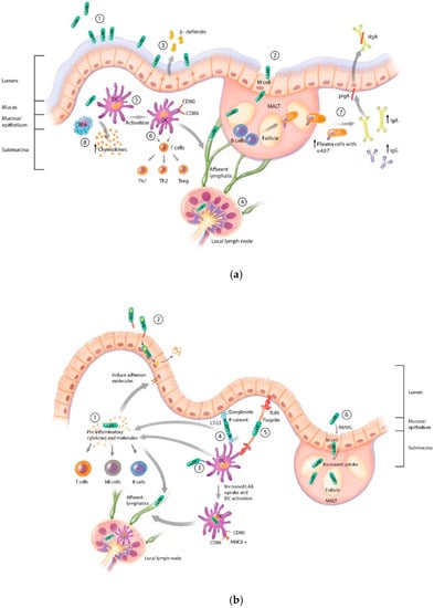 To understand the effect that adjuvant strategies have on the immune response to a LAB mucosal vaccine, it is important to review the endogenous immune activating mechanisms possessed by LAB. A brief summary of typical LAB interactions with the mucosal immune system are depicted in Figure 1a.