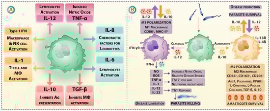 (A) Cytokines secreted by macrophages and their effects on immune system; (B) M1 and M2 type macrophages polarization in Leishmania infection and its implication on disease pathogenesis.