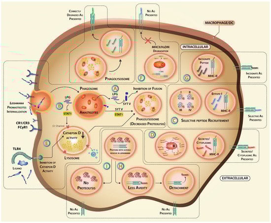 Leishmania-dependent factors affecting antigen priming leading to inefficacy of vaccination. Upon entry into the macrophages, (A) Leishmanial lipophosphoglycan (LPG) inhibits fusion of phagosome with lysosome via inhibition of SytV recruitment. (B) It also inhibits STAT-1, which is responsible for maintenance of conductivity of Cl- ion channels for phagosomal acidification following phagolysosome formation. (C) Amastigote-expressing proteins, which have high turnover during infection, can trigger intracellular competition among the peptides and influence determinant selection. (D) Cytoplasmic and secretory proteins of parasites have better chances of being processed and presented, inducing a bias towards the antigens to be predominantly presented to T cells. (E) TLR4-induced inhibition of Cathepsin D activity may reduce protein processing ability. (F) MHC-II and H2-DM molecules are taken up by amastigotes inside phagolysosome and degraded. (G) Infection-induced loading of incognate peptides instead of Leishmanial peptides can affect antigenic loading on MHC molecule. (H,I) Leishmanial antigens that may have substitutions in anchor residues or protease cleavage sites may either bind weakly to MHC-II, become resistant to action of proteases, or may function as altered peptide ligands, if selected for presentation to T cells.