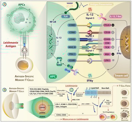 The dynamics of APC–T cell interaction, expression levels of co-stimulatory and co-inhibitory molecules, and the cytokine milieu play decisive roles in the anti-leishmanial immune response. In the lymph node, T cells move through a meshwork of APCs, and on recognizing MHC-bound cognate antigen, forms a contact zone—immune synapse (IS)—at the T cell/APC interface. Exposure to chemokines during extravasation activates the adhesion molecules on T cells, leading to the interdigitation of cell’s glycocalyx. Adhesion occurs mainly through T cells expressed αLβ2 integrin LFA-1, which upon activation interacts with ICAM-1 expressed on endothelial cells. TCR signaling micro-clusters forms at the periphery of IS, which gradually moves inward by the retrograde flow of actin cytoskeleton and coalesce to form the main contact zone or core supramolecular activation cluster (cSMAC). cSMAC comprises of TCR-MHC complex enriched with Src-family kinases like Lck and Fyn, CD28, protein kinase C θ (PKCθ) and zeta-chain-associated protein kinase 70 (ZAP-70). In addition to this, interaction occurs at segregated contact zones or peripheral SMAC (p-SMAC) via LFA-1/ICAM-1, CD2/CD58 interaction [153,154]. pSMAC also has the cytoskeletal linker protein talin. The outermost distal SMAC (dSMAC) has CD43 and CD45 and performs mechano-supportive role. These molecular interactive forces are at peak after 30 min [155]. Once the T cell is in contact with the APC, TCR conveys a stop signal, forming a stable junction IS [156]. As an effect of LFA-1 and ICAM-1 interaction, downstream signaling events result in cytoskeletal remodeling and T cell motility [157] (Figure 4).
