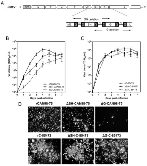 3.1. In Vitro Characteristics of ΔG- and ΔSH-HMPV Recombinant Viruses Differ Depending on the Viral Strain Background