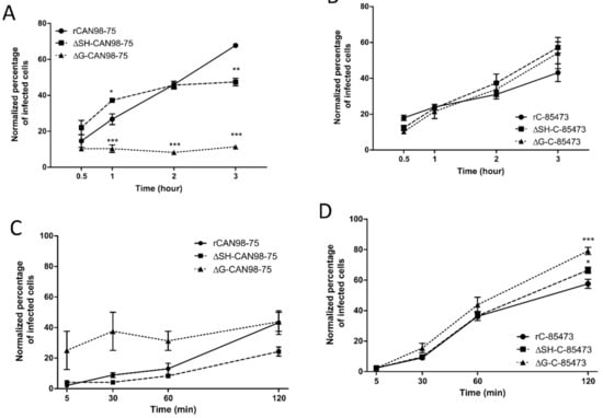 Regarding cell entry kinetics, the ΔSH-CAN98-75 virus seemed to enter LLC-MK2 cells slower than its WT counterpart and the ΔG-CAN98-75 virus, with 24% of ΔSH-CAN98-75-infected cells after 120 min compared to 43% for WT and ΔG-CAN98-75 viruses (Figure 2C). Conversely, the three rC-85473-derived viruses showed rather rapid cell entry kinetics with more than 36% of infected cells after 60 min. Interestingly, both ΔSH- and ΔG-C-85473 viruses showed higher entry properties compared to their WT counterpart after 120 min with 66%, 79% and 57% of infected cells, respectively (Figure 2D).