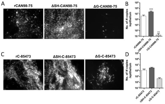 Based on the GFP expression pattern within the infected HAE at 5 dpi, we observed that the ΔSH-CAN98-75 spread more efficiently than its WT counterpart, at the difference of the ΔG-CAN98-75 virus, which appeared dramatically impaired (Figure 3A). These results were confirmed by the quantification of N gene copies number within the infected epithelium. In line with the fluorescent microscopy observations, the viral quantifications at 5 dpi indicated a significant six-fold higher viral replication of the ΔSH-CAN98-75 virus and 3.3 log10 lower values for the ΔG-CAN98-75 virus in comparison to the WT CAN98-75 virus (Figure 3B). At the difference, the ΔSH-C-85473 virus acted similarly to its WT counterpart, considering both spread pattern and viral replication within the HAE model (Figure 3C,D). In addition, the spread of the ΔG-C-85473 virus seemed to be more affected in HAE model than in LLC-MK2 monolayer (Figure 3C) even though its replication diminished slightly in comparison to the WT rC-85473 virus, considering the 30-fold decrease of the number of N gene copies (Figure 3D).