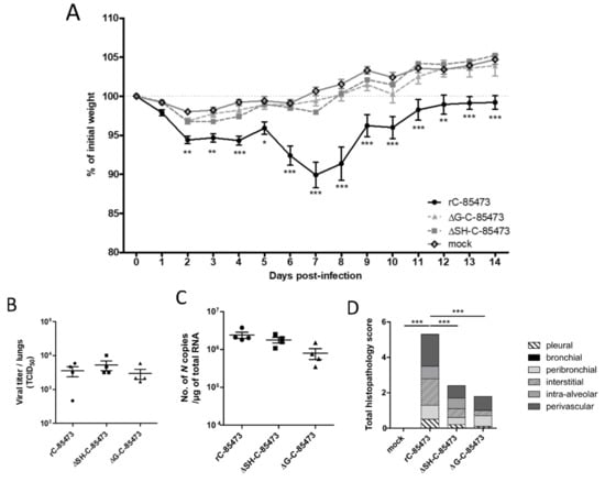 We therefore infected mice intra-nasally with 5 × 105 TCID50 of either ΔG-C-85473 or ΔSH-C-85473 viruses, the equivalent non-lethal dose inoculum needed to induce a significant (>10%) weight loss with the WT rC-85473 virus at 7 dpi (Figure 4A). Similar to the mock (non-infected) group and in contrast with the WT rC-85473, neither weight loss nor clinical signs were observed in the ΔG-C-85473 and ΔSH-C-85473-infected groups during the 14-day follow-up. In contrast, lung viral titers at 5 dpi were comparable between WT and deleted viruses, as determined by both cell culture and molecular methods (Figure 4B,C). In agreement with the weight curves, lower histopathological scores were recorded for both ΔG-C-85473 and ΔSH-C-85473-infected mice compared to the WT group (1.8 and 2.4 versus 5.3, respectively), particularly owing to significant reductions in interstitial, perivascular and/or intra-alveolar inflammation (Figure 4D).