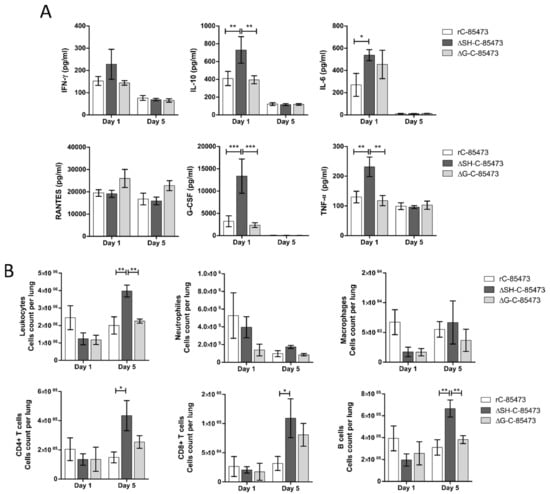 Moreover, immunization with ΔSH-C-85473 and ΔG-C-85473 fully protected mice against viral challenge with rC-85473 (Figure 5, Table 2). Remarkably, the post-challenge antibody response induced in both vaccinated groups was also effective against a heterologous HMPV B strain (Table 2), contrary to what was observed for the mock-immunized yet challenged group. Evaluation of the real cross-protection potential of immunization with ΔSH-C-85473 and ΔG-C-85473 candidates is needed. Additionally, ΔSH-C-85473-immunized mice showed a distinct pulmonary cytokine/chemokine profile after viral challenge, with a significant increasing expression of several HMPV-response related markers compared to the WT and ΔG-C-85473 immunized groups (Figure 6A). Interestingly, a high expression of IL-10 cytokine [45] and G-CSF chemokine, which were reported as T-cell activators [46], was concomitant with an enhanced recruitment of immune cells (T CD4+, T CD8+, B cells) in lungs of ΔSH-C-85473-immunized mice at five days post-challenge (Figure 6B). Moreover, such a production of anti-inflammatory cytokine/chemokine counteracts the observed increased production of TNF-α and IL-6 pro-inflammatory (Figure 6A).