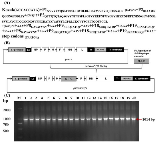 The IBV S1 multi-epitope cassette S-T/B, constructed previously, was inserted between P and M genes in the LaSota genome as an additional transcriptional unit [26]. The full-length plasmid clone pBR-LS was linearized at the 5′-NTR of the NDV LS M gene by PCR using PFU Ultra Fusion HS DNA polymerase (Agilent, Santa Clara, CA, USA) and vector-specific primers to include the complete sequence of this clone. The S-T/B fragment fused with gene-end (GE), intergenic (IG), gene-start (GS), and Kozak sequences was amplified by overlapping PCR and ligated with the linearized pBR-LS using an In-fusion PCR clone kit (Clontech, Mountain View, CA, USA). The constructed plasmid, named pNDV-IBV-T/B, was confirmed by sequencing analysis. The NP, P, and L genes of LaSota were amplified from the pBR-LS plasmid, and the PCR products were subcloned into the pVAX1 vector (Thermo Fisher Scientific, Waltham, MA, USA) to obtain helper plasmids named pV-NP, pV-P, and pV-L, respectively. The pNDV-IBV-T/B, pV-NP, pV-P, and pV-L plasmids (ratio of 4:2:1:1) were co-transfected into the replication-deficient vaccinia virus (VV) MVA-T7-infected BHK-21 cells with Lipofectamine™ 3000 reagent (Thermo Fisher Scientific, Waltham, MA, USA). At 6 h post-transfection, cells were washed twice, then cultured in DMEM containing 1% penicillin (10,000 IU)-streptomycin (10,000 μg/mL) and 0.2 μg/mL N-tosyl-L-phenylalanine chloromethyl ketone (TPCK)-trypsin for another 72 h. The viruses were harvested by freeze-thawing for 3 times and serially passaged 20 times (P20) in 10-day-old SPF chicken embryos.