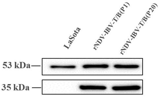 One MOI of two different passages (P1 and P20) of rNDV-IBV-T/B and the parental strain LaSota were used to infect DF1 cells for 24 h, and the cell lysates were harvested and analyzed by Western blot using rabbit polyclonal anti-IBV serum and a mouse monoclonal anti-NDV/NP antibody. The protein expressed from the IBV S1 protein multi-epitope cassette and the NDV NP protein were found at ~35 and 53 kDa bands in P1 and P20 of rNDV-IBV-T/B lysates, however, the parental virus strain LaSota only had the ~53 kDa NP protein band (Figure 2), confirming that rNDV-IBV-T/B successfully expressed the IBV S1 protein multi-epitope cassette in vitro and that the protein was antigenic, as evidenced by its recognition on a Western blot by anti-IBV serum. The expression of the IBV S1 protein multi-epitope cassette, through at least twenty passages of the recombinant NDV, remained stable, indicating genetic stability of rNDV-IBV-T/B.