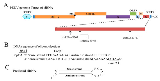 Schematic description of the target viral genome, and small interfering RNA (siRNA)-expressing cassette. (A) Genomic structure of porcine epidemic diarrhea virus (PEDV) and position of target short hairpin RNA (shRNA) at N gene. ShR-N307, shR-N463, and shR-N1071 indicate initial shRNA target sites; (B) sequences and design map for shRNA constructs; (C) structure of predicted shRNA.