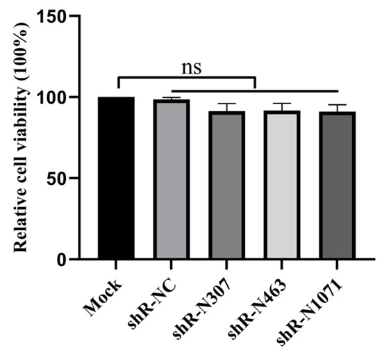 ShRNAs induce large amounts of cell death when transfected at large volume, resulting in interference with experimental results. To detect if the three shRNAs we used led to cytotoxicity at 4 μg, IEC cells were seeded in 96-well microplates and transfected with shR-N307, shR-N463, shR-N1071, or shR-NC (4 μg) using Lipofectamine 3000 (Invitrogen), or transfected with transfection reagent alone as mock. After transfecting for 48 h, CCK-8 solution (10 μL) was added to wells, and plates were incubated at 37 °C for 2 h. Absorbance was measured at 450 nm using a microtiter plate reader (Bio-Rad, Hercules, CA, USA). Viable cells that were mock transfected with transfection reagent alone were the reference of 100% cell viability. ShR-N307, shR-N463, and shR-N1071 exhibited no obvious cytotoxicity in transfected Vero E6 and IEC cells at 4 μg (Figure 3).