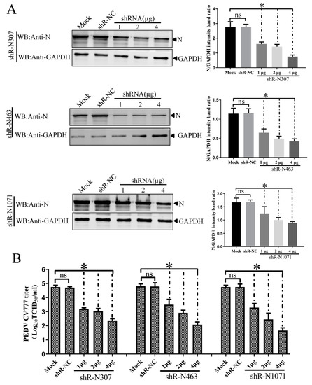 Dose-dependent inhibitory effects of shR-N307, shR-N463, and shR-N1071 against N on target gene expression and PEDV CV777 replication in infected IEC cells. IEC cells with shRNA (1, 2, 4 μg) for 24 h before infection with PEDV CV777 for 48 h. (A) PEDV N protein by Western blot with anti-N protein monoclonal antibody (mAb). Densitometric data for N/GAPDH from three independent experiments, shown as means ± SD. * p < 0.05. The p value was calculated using Student’s t-test; (B) PEDV CV777 titers in shRNA-transfected IEC cells. ShRNA transfection and viral infection were as in panel A. Viral titers in supernatants collected at 48 hpi were determined using the Reed–Muench method. Error bars represent standard errors of the mean from three independent experiments. * p < 0.05. The p value was calculated using Student’s t-test.
