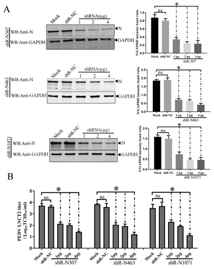 Dose-dependent inhibitory effects of shR-N307, shR-N463, and shR-N1071 directed against N on target gene expression and PEDV LNCT2 replication in infected IEC cells. IEC cells with shRNA (1, 2, 4 μg) for 24 h were infected with PEDV LNCT2 for 48 h. (A) PEDV N protein was detected by Western blot with anti-N protein mAb. Densitometric data for N/GAPDH from three independent experiments are shown as means ± SD. * p < 0.05. The p value was calculated using Student’s t-test; (B) PEDV LNCT2 titers in shRNA-transfected IEC cells. ShRNA transfection and viral infection were as in panel A. Viral titers in supernatants collected at 48 hpi were determined using the Reed–Muench method. Error bars represent standard errors of the mean from three independent experiments. * p < 0.05. The p value was calculated using Student’s t-test.