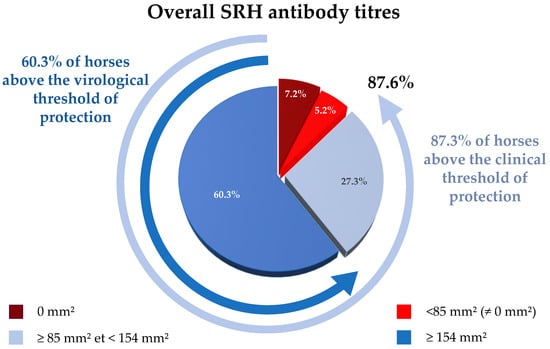 Nearly 9% (8.8%) of serum samples from horses located in Auvergne-Rhône-Alpes (n = 21) were below 85 mm2, including 4.2% samples with SRH antibody titer = 0 mm2. Of the samples, 31.3% were ≥85 mm2 and <154 mm2 (126.6 ± 20.6 mm2; n = 75) and 60.0% were ≥154 mm2 (198.3 ± 31.0 mm2; n = 144). Overall, 91.3% of serum samples tested possessed SRH antibody titers above the clinical protection threshold (85 mm2). A significant difference was observed between the serum samples from horses located in this region and those based in others (p-value = 0.016). No difference was measured between the two categories analyzed (p-value = 0.14).