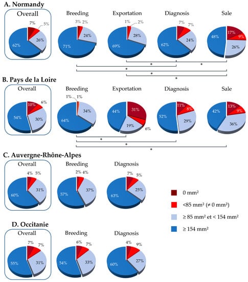 Sixteen percent of serum samples from horses located in Pays de la Loire (n = 43) were below 85 mm2, including 10.4% samples with SRH antibody titer = 0 mm2. Of these samples, 30.5% were ≥85 mm2 and <154 mm2 (130.6 ± 19.5 mm2; n = 82) and 53.5% ≥154 mm2 (196.4 ± 28.3 mm2; n = 144). Overall, 84% of serum samples tested possessed SRH antibody titers above the clinical protection threshold (85 mm2). A significant difference was observed between the serum samples from horses located in this region and those based in Normandy and Auvergne-Rhône-Alpes (p-value = 0.027). The breeding category showed a frequency of serum samples with SRH antibody titers above 85 mm2 significantly higher (97.9%; p-value = 0.00081) compared to exportation, diagnosis and sale categories (63.8%, 80.6% and 77.8%, respectively).