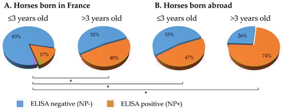 Comparison of equine influenza virus (EIV) nucleoprotein (NP) ELISA results between serum samples from young (≤3 years) and older (>3 years) horses at the time of sampling, which were seropositive by SRH test. Results for horses born in France (A) or abroad (B). (✻) p-value ≤ 0.006.