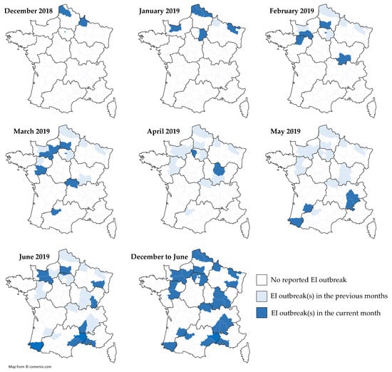 Localization of the French EI outbreaks at the county level, month by month. For each month, new EI cases are highlighted in dark blue, cases from previous months localized in the same county are highlighted in light blue.