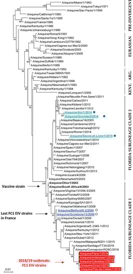 The French horse population regroups 1.106 million horses (as recorded in 2016), which represents 15% of the European equid population with France placed third in terms of number behind Germany and the United Kingdom. Despite active disease surveillance that involves around 800 equine veterinary practitioners taking part in the French equine pathology epidemiological surveillance network (RESPE), EI has not been detected in France between mid-2015 to early December 2018 []. During this period, there was evidence of EIV circulation in other European countries and worldwide [,,,]. Since early December 2018, several European countries (Belgium, France, Germany, Ireland, the Netherlands, Sweden and the United Kingdom) have reported unusual levels of EIV circulation. The number of EI outbreaks is staggering in some countries, with more than 200 outbreaks reported in the United Kingdom between January and October 2019, leading to a 6 day shutdown of horse racing in February (the last shutdown linked to EI dated from 1979) and more than 174 racing stables placed in lockdown with mandatory EIV testing. This situation, unseen in Europe since the late 1970s and 1980s, reminds us of the impact of the 5 months long EI in Australia in 2007, when over 76,000 horses were infected with EIV and with an economical cost reaching A$1 billion []. The H3N8 EIV at the origin of the current European outbreaks belongs to the Florida Clade 1 (FC1) sub-lineage, which was usually circulating in North and South Americas [,,,] with only occasional appearances in Europe from time to time []. FC1 EIV strain was not isolated in France since 2009 [].