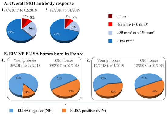 Comparison of overall SRH antibody response (A) and EIV NP ELISA (B) between two periods of sampling: September 2017 to February 2018 (1) and December 2018 to April 2019 (2). EIV NP ELISA results between serum samples from young (≤3 years; located in Normandy) and older (>3 years; located in the north of France) horses born in France and seropositive by SRH test. (✻) p-value ≤ 0.007.