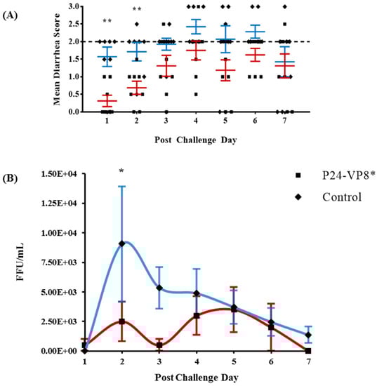 P24-VP8* vaccine protected against VirHRV diarrhea and reduced overall virus shed among vaccinated pigs. Fecal consistency (A) and virus shedding (B) were monitored daily from post challenge day (PCD) 1 to PCD 7 after the challenge with VirHRV. Fecal consistency scores ≥2 were considered to be diarrheic (dashed line indicates the threshold of diarrhea). Statistical significance between vaccinated and control groups, determined by multiple t tests, are indicated by asterisks (*, p < 0.05; **, p < 0.01).