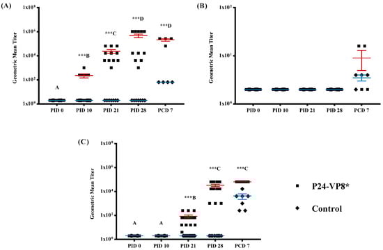 Geometric mean VP8*-specific IgG (A) and IgA (B) and Wa-HRV neutralizing (C) antibody titers in serum collected from Gn pigs at PID 0, 10, 21, 28, and PCD 7. Pigs were vaccinated with P24-VP8* vaccine or Al(OH)3 adjuvant only. Each serum specimen was tested at an initial dilution of 1:4. Negative samples were assigned an arbitrary value of 2 for calculation and graphical illustration purposes. Comparisons between groups at the same time points were carried out using Student’s t-test and significant differences are identified by *** (n = 10–15; p < 0.001). Tukey-Kramer HSD was used for the comparison of different time points within the same group, where different capital letters (A, B, C, D) indicate a significant difference, p < 0.01, and shared letters indicate no significant difference.