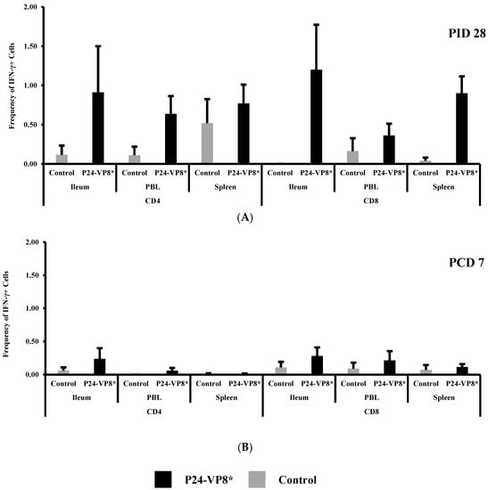 Frequencies of IFN-γ+CD8+ and IFN-γ+CD4+ T cells in ileum, peripheral blood (PBL), and spleen at PID 28 (A) and PCD 7 (B). Two-way ANOVA followed by Multiple t-tests were carried out for comparisons. (n = 3–8; p < 0.05). There were no significant differences.