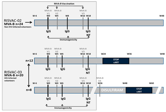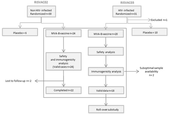 The present substudy analyzes the safety and immunogenicity against vaccinia virus of MVA-B in HIV-uninfected and HIV-infected volunteers in two phase I double-blind placebo-controlled clinical trials: RISVAC02 [10] and RISVAC03 [11], respectively. MVA-B contains the codon-optimized HIV-1 clade B inserts BX08-gp120 and IIIB-GPN. The HIV inserts are placed in the thymidine kinase locus of the viral genome, and during infection gp120 is expressed as a secreted product and GPN as an intracellular fusion polyprotein. MVA-B was generated as described [12] by IDT Biologika GmbH, Germany. In RISVAC02, HIV-uninfected male and female volunteers between 18 and 55 years old, at low risk of HIV-1 infection, with an absence of vaccinia-specific antibodies and no history of previous smallpox vaccination were recruited and randomized to receive MVA-B (n = 24) or placebo (n = 6). In RISVAC03, HIV-1-infected patients older than 18 years and under successful treatment with a CD4 T cell count >450 cells/mm3 were included and randomly allocated (balanced randomization (2:1)) to receive MVA-B (n = 20) or placebo (n = 10). MVA-B was administered in three intramuscular injections (1 × 108 pfu/dose in 0.5 mL) at weeks 0, 4, and 16. In RISVAC03 an analytical treatment interruption (ATI) was performed in 20 patients (vaccines n = 12, placebo n = 6) at week 24 (after the last dose of MVA-B) for 8 weeks. The other 10 participants (vaccines n = 8, placebo n = 4) started a rollover substudy including disulfiram, then antiretroviral therapy (ART) was discontinued at week 48. In all 30 patients the dynamics of the viral rebound were assessed during the first 12 weeks after ART interruption. ART was resumed when national guideline criteria for the initiation of therapy were reached. For this substudy we only analyzed the results of the patients who had received the vaccine. See Figure 1 for schedule and Figure 2 for participant disposition. Both studies were explained to all patients in detail, and all gave written informed consent. The studies were approved by the institutional ethical review board and by the Spanish Regulatory Authorities.