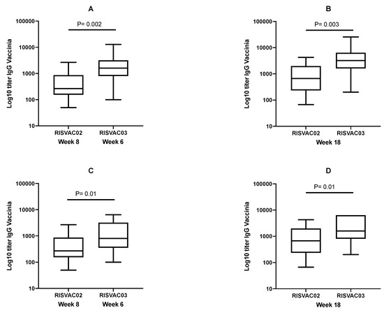Binding antibodies (IgG titers) against vaccinia virus in RISVAC02 compared to RISVAC03. (A) at weeks 8 and 6, respectively; (B) at week 18; (C) at weeks 8 and 6, respectively, only including participants without previous exposition to vaccinia virus; and (D) at week 18, only including participants without previous exposition to vaccinia virus.